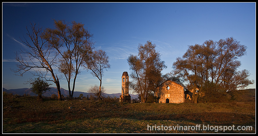Продължих към язовир Копринка понеже бях виждал интересни есенни кадри оттам, но се оказах закъснял, видима есен нямаше. Реших да потърся поредната изоставена църква в западния край на язовира край село Виден. Мястото е малко странно там, блатисто с разпръснати горички и църква не се виждаше никъде. Попитах единствения човек, който срещнах по прашния път и той с започна да ръкомаха с неистов ентусиазъм…беше ням. Все пак не спря, докато явно погледът ми е почнал да става по-разбиращ и като се вгледах на където сочеше, видях тъмния силует на постройката сред малка горичка. Беше изцяло на сушата, което веднага ме надъха да пробвам да се върна рано на пролет, когато язовирът стига до това място.