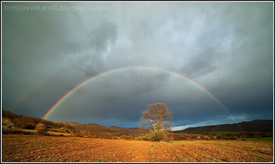 В този случай всичко почна от една нива с едно дърво, което се оказа под едно особено небе. Духаше и валеше, но важното беше, че на запад точно по залез облаците пропускаха светлина, което можеше да означава само едно – дъга. Трябваше само да изчакаме в калната нива на дъжда, който валеше странно, понеже вятърът беше силен. Сефте. След няколко тъпи минути дъгата започна да се материализира. Настана снимачната лудост, все пак това беше нещо, което до този момент ми липсваше в колекцията. Задържа се достатъчно, за да и направя около двадесет кадъра, но има смисъл да покажа само един, в който светлината ми харесва най-много: